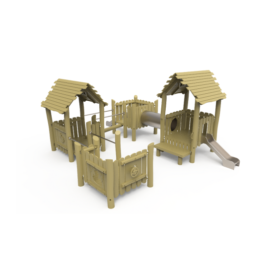 İki kule ve sallanan köprü bağlantılı orta ölçek model. Spiral kaydırak, ip tırmanma ağı ve çift salıncak entegrasyonu. 60–120 m² alan için ideal.