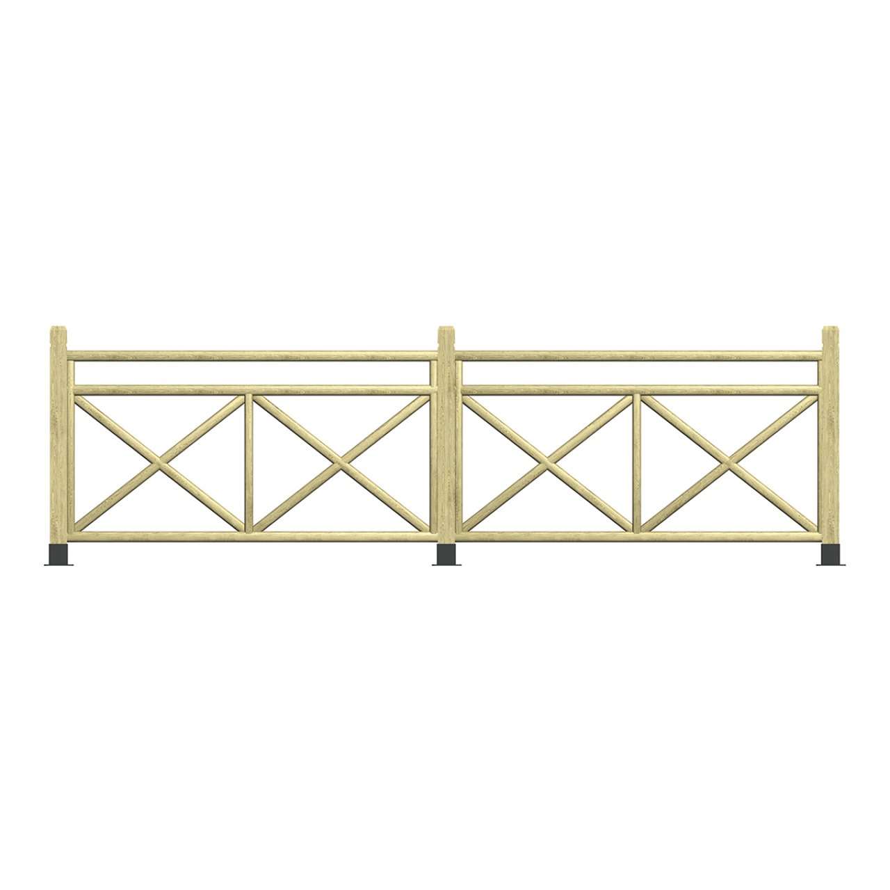 Özellikle teraslar, verandalar, kafe sınırları ve havuz çevreleri gibi yarı-yapısal alanlar için mükemmeldir. Standart çitlerin aksine, üzerindeki yatay hat sayesinde bir “tırabzan” havası yaratır ve görsel olarak sınırları daha net çizer. Her bir panel bölümünde kullanılan ikili çapraz (X) yapı, çitin doluluk oranını artırarak daha tok bir duruş sergilerken, baba direklerin sağlamlığıyla birleşerek güvenli bir bariyer oluşturur. Zemindeki metal ayaklar, yapıyı nemden koruyarak uzun yıllar dayanmasını sağlar.