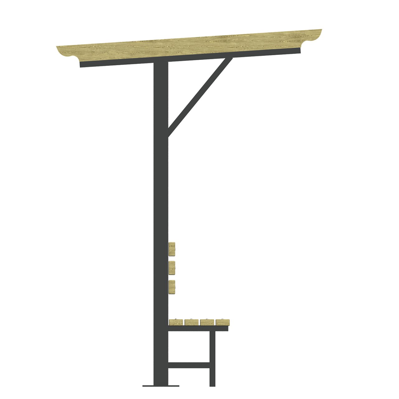 Standart dört ayaklı kamelyaların sığmadığı dar kaldırımlar veya koridorlar için en ideal çözümdür. Arkadaki güçlü metal direklere entegre edilmiş sırtlıklı ahşap bank, yapının bir parçasıdır; bu sayede rüzgarda uçma veya yerinden oynama riski yoktur. Metal iskeletin siyah rengi ile ahşap çatı latalarının doğal uyumu, endüstriyel ve modern bir görünüm sunar. Kurumsal sigara içme alanları veya otobüs durakları için prestijli bir tercihtir.