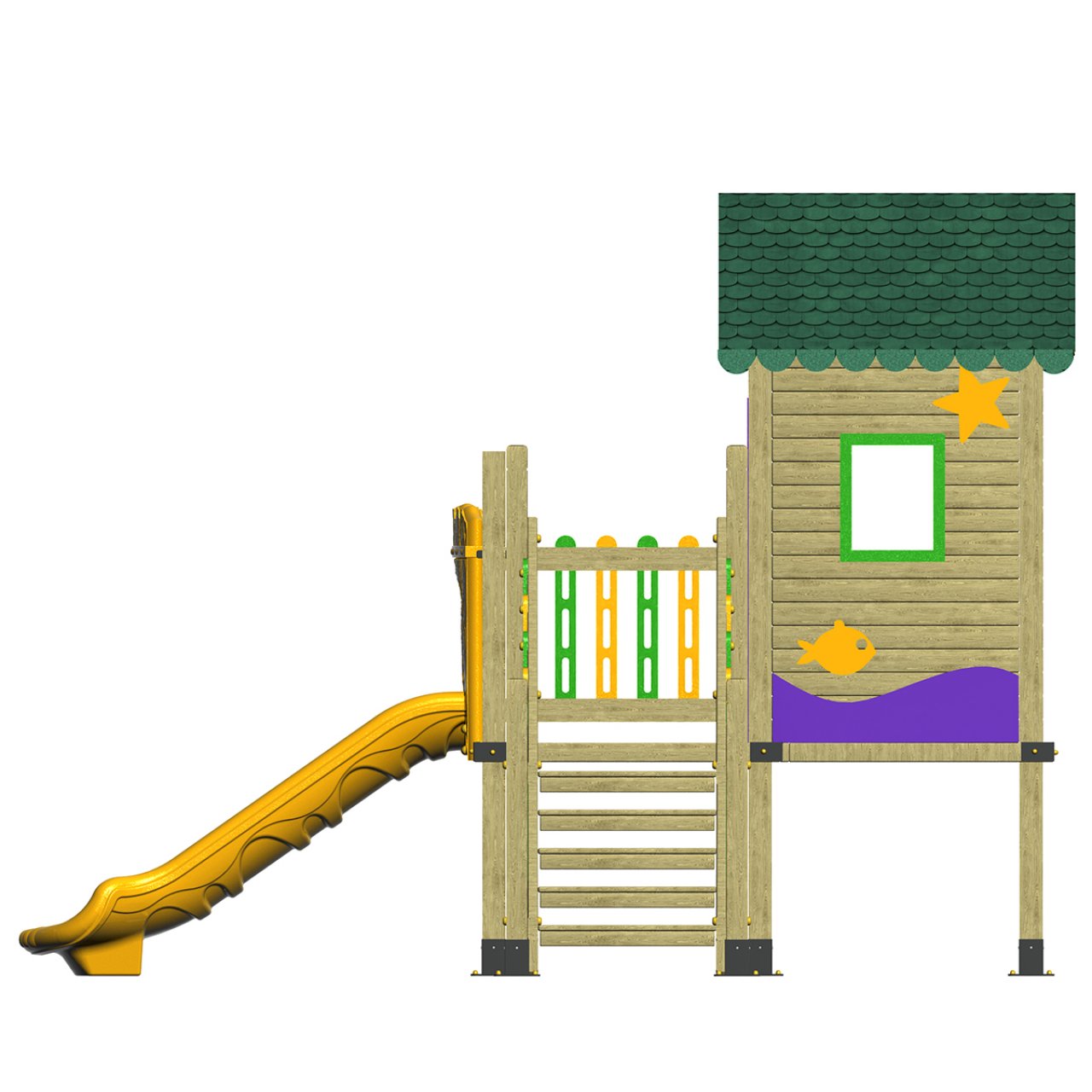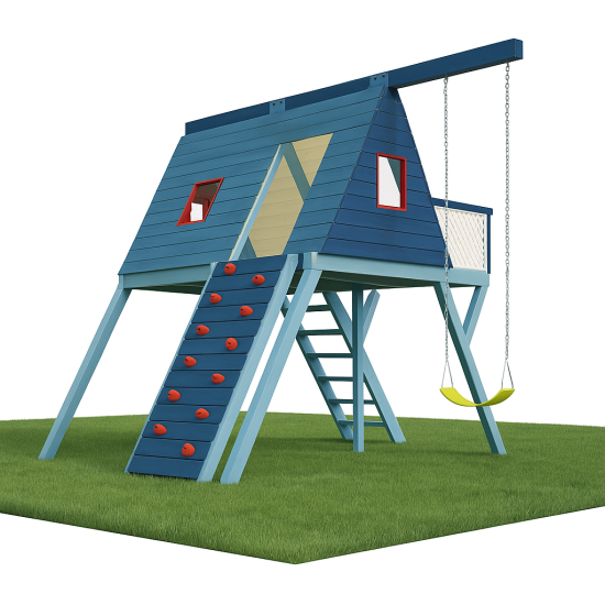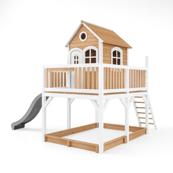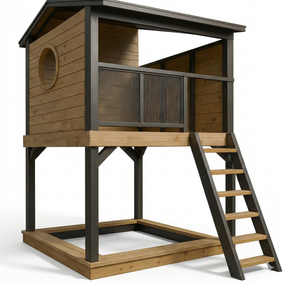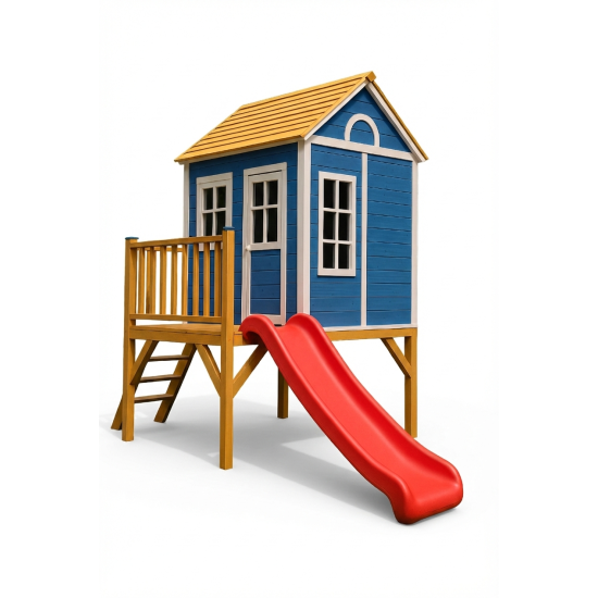 Ürünün ana gövdesi, çatısı ve taşıyıcı dikmeleri, dış mekan koşullarına karşı emprenye edilerek çürümeye ve böceklenmeye karşı koruma altına alınmış 1. sınıf doğal ahşap malzemeden üretilmiştir. Çatı kenarları, pencere pervazları ve korkuluk detayları, projenizin renk paletine uyum sağlaması amacıyla dilediğiniz renk kombinasyonlarında (HDPE veya Plastik aksamlarla) üretilebilir. Geniş merdivenlerden güvenle çıkan çocuklar, korunaklı kulübe alanında vakit geçirebilir ve polietilen düz kaydıraktan neşeyle kayabilirler.