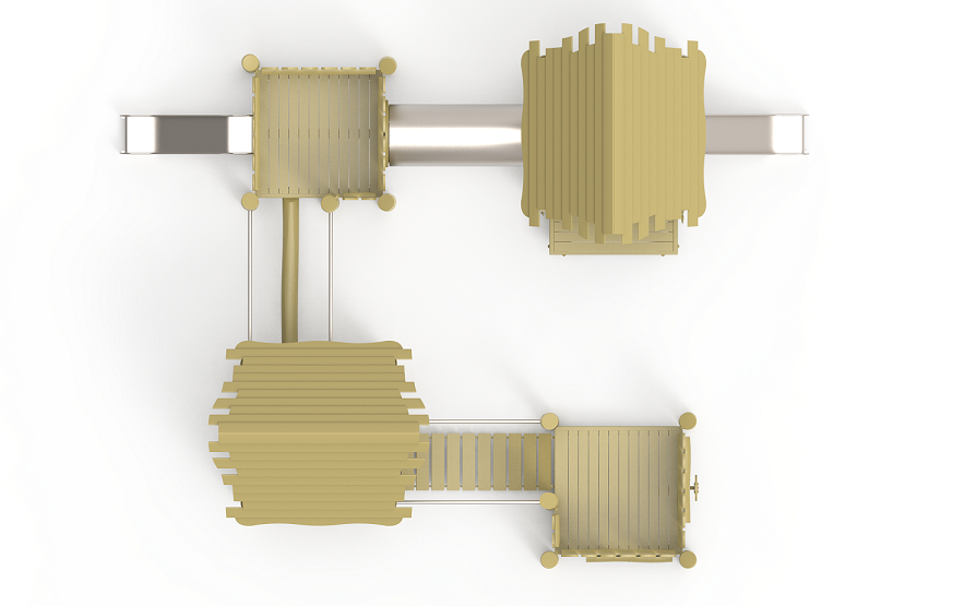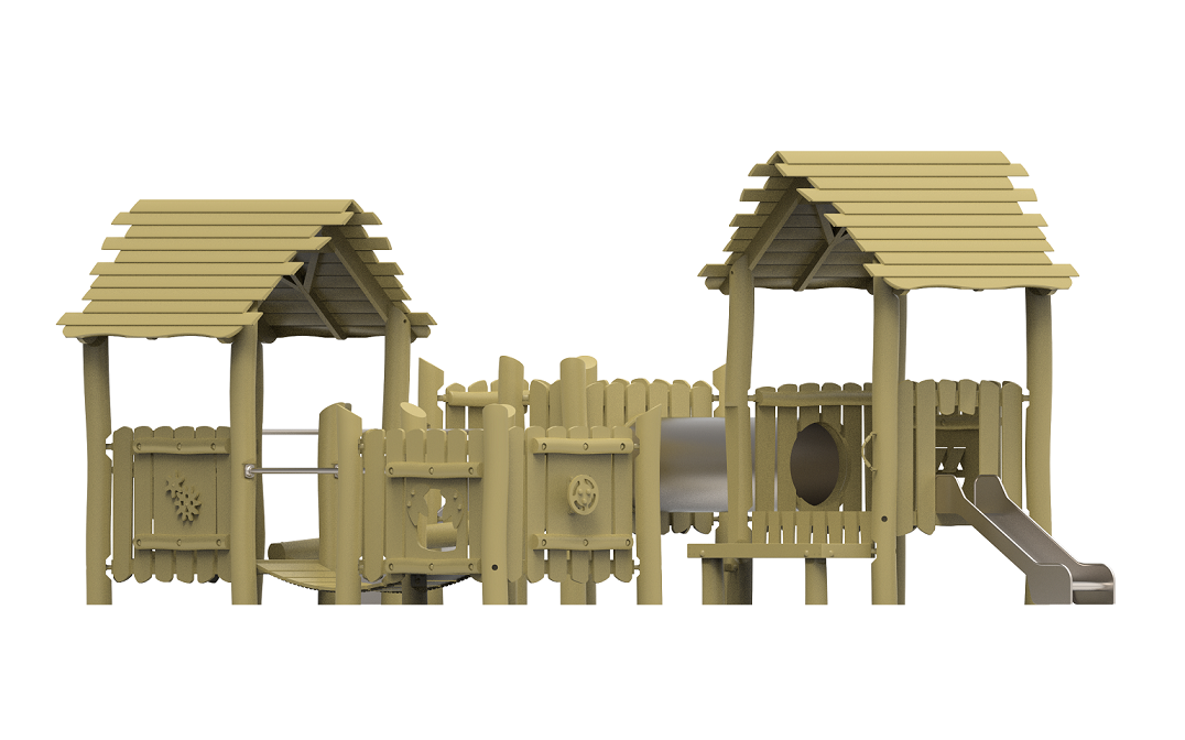 Ürünün en dikkat çekici özelliği, iki kuleyi birbirine bağlayan, fütüristik görünümlü gümüş renkli Tüp Tünel Geçiş (Tube Tunnel) modülüdür. Diğer kuleler arasındaki bağlantılar ise denge yeteneğini geliştiren Ahşap Köprü ve tekli Denge Kütüğü ile sağlanır. İki kulesinde bulunan asimetrik ahşap çatılar ve paslanmaz (krom) görünümlü Metal Kaydırak, yapının hem doğal hem de modern görünmesini sağlar. Ayrıca alt platformlardaki Gemi Dümeni gibi interaktif paneller, küçük yaş grupları için rol yapma oyunlarını destekler.