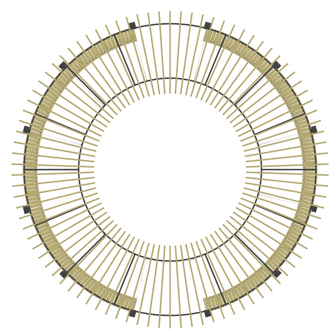 Mevcut doğayı koruyan ve onu tasarımın merkezi yapan eşsiz bir yapı. Bu Dairesel Metal Pergola, ortası açık “atrium” tipi tasarımıyla, parklarınızdaki yaşlı bir çınar ağacını veya dekoratif bir süs havuzunu çevreleyerek gölgelendirmek için üretilmiştir. Radyal (merkezden dışa doğru yayılan) ahşap çatı lataları, güneş ışığını estetik bir şekilde kırarak zeminde büyüleyici gölge oyunları yaratır.