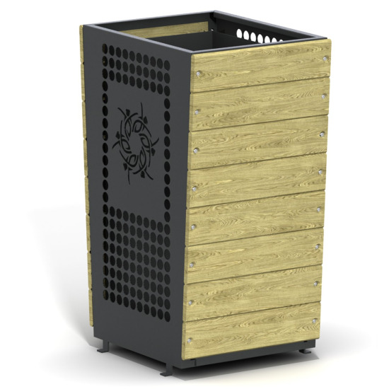 Sanatsal Lazer Kesim ve Doğal Ahşap Uyumu Yan yüzeyleri yatay ahşap çıtalarla kaplanmış, ön yüzeyi ise lazer kesim dekoratif motiflerle işlenmiş şık bir dış mekan çöp kutusu. Antrasit metal ön panel üzerindeki dairesel çerçeve delikleri ve merkezdeki özel sanatsal figür (motif), ürünü sıradan bir çöp kovasından ayırarak park ve bahçeler için dekoratif bir objeye dönüştürür.