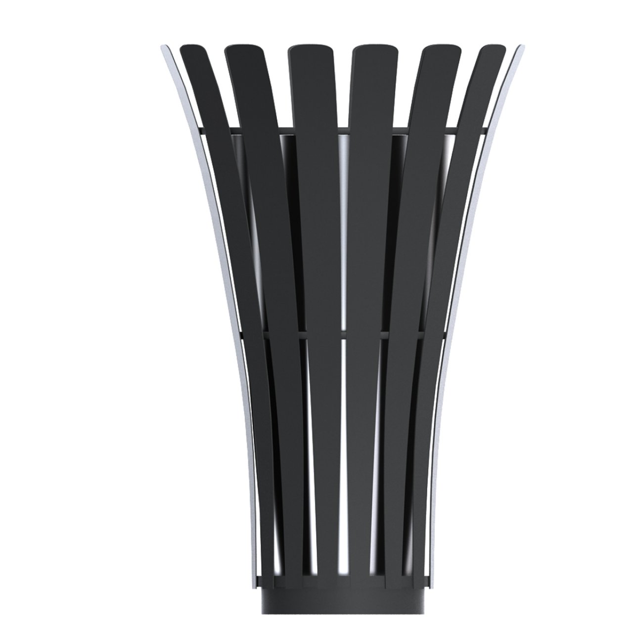 Heykelsi Tasarım ve Geniş Atık Haznesi Tabandan başlayıp yukarıya doğru genişleyen konik yapısıyla bir vazoyu veya açılan bir çiçeği andıran, estetik değeri yüksek dış mekan çöp kutusu. Ürünün dış iskeleti, belirli aralıklarla dizilmiş dikey metal lamaların (şeritlerin) yukarı doğru kavislenerek açılmasıyla oluşturulmuştur. Bu kafes yapısı, içteki atık kovasını hem korur hem de modern bir görünüm sağlar. Yukarıya doğru genişleyen bu form, çöp atma ağzının oldukça geniş olmasını sağlayarak kullanıcılara (özellikle hareket halindeyken) büyük kolaylık sunar.