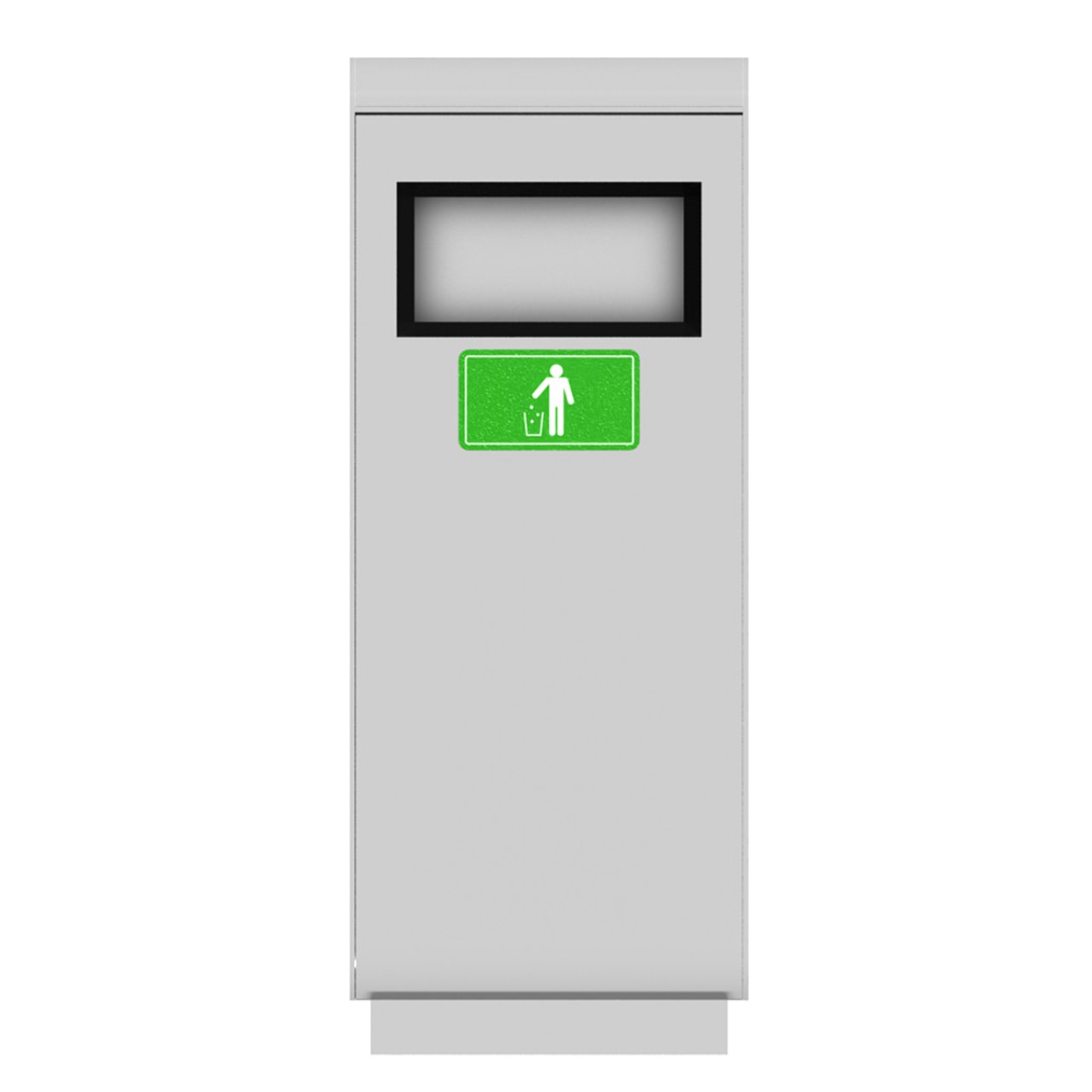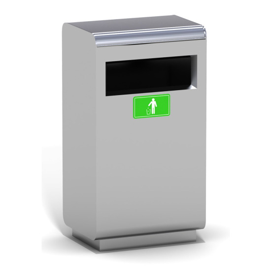 Minimalist Tasarım ve Net İşaretleme Keskin köşelerin yuvarlatıldığı (radiuslu) dikdörtgen prizma formunda tasarlanmış, sade ve şık dış mekan çöp kutusu. Ürünün en belirgin özelliği, pürüzsüz metal yüzeylerin yarattığı bütünlüktür. Ön yüzeyin üst kısmında yatay dikdörtgen formlu atık atma penceresi bulunur. Bu pencerenin hemen altında yer alan bilgilendirme levhası/ikonu, ürünün kullanım amacını net bir şekilde belirtir ve yönlendirme sağlar. Alt kısımdaki baza (kaide) yapısı, gövdeyi zeminden hafifçe yükselterek hem estetik bir bitiş sağlar hem de zemin suyundan korur.
