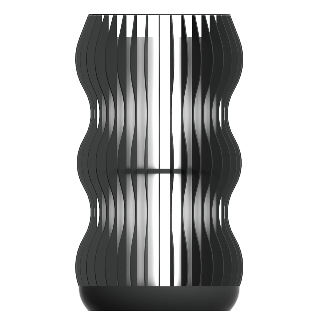 Heykelsi Tasarım ve Görsel Derinlik Standart düz yüzeyli modellerin aksine, boğumlu ve dalgalı (sinüzoidal) bir siluet çizen özel tasarım dış mekan çöp kutusu. Ürünün dış iskeleti, bu dalgalı formu takip edecek şekilde lazerle kesilmiş veya bükülmüş dikey metal lamaların (şeritlerin) sıralanmasıyla oluşturulmuştur. Bu kafes yapısı, içteki silindir atık haznesini sararak hem korur hem de ışık-gölge oyunlarıyla ürüne görsel bir derinlik kazandırır. Alt ve üst kısımdaki sağlam çemberler yapıyı bir arada tutarken, ürünün tabanındaki ağırlık merkezi devrilmelere karşı direnç sağlar.