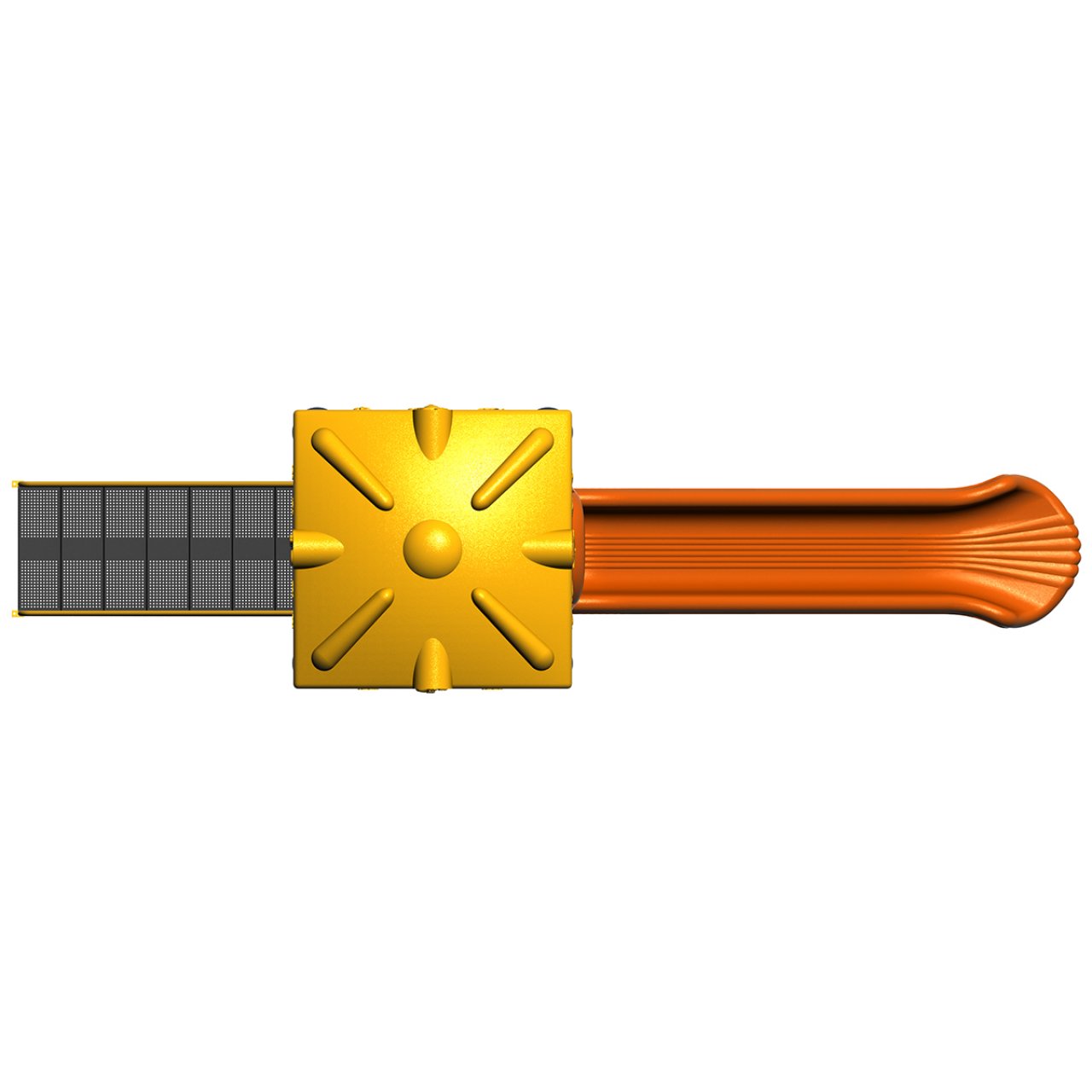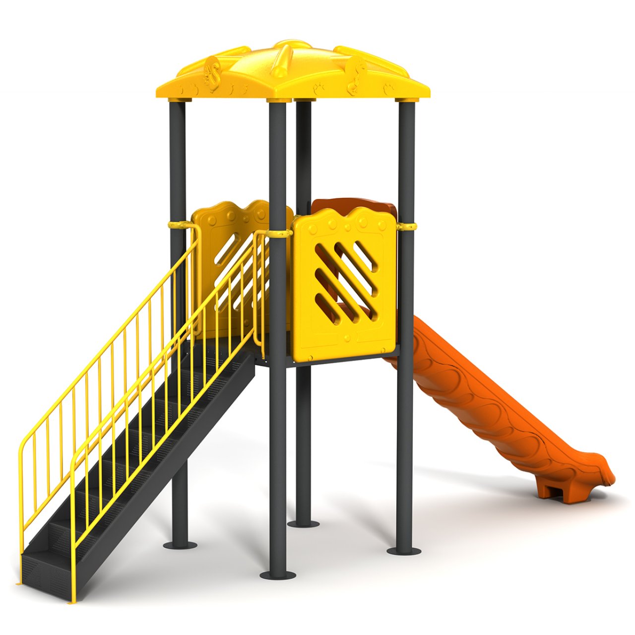 Ürünün taşıyıcı sistemi, dış mekan koşullarına dayanıklı, elektrostatik fırın boyalı metal boru profillerden oluşur. Kuleye çıkışı sağlayan metal merdivenler, çocukların düşmesini önleyen korkuluklarla donatılmıştır. Kulenin üzerindeki Polietilen (PE) Çatı, çocukları güneşten korurken parka estetik bir görünüm katar. Platformdan aşağı inen Düz Kaydırak ve güvenlik panelleri, yine canlı renklere sahip dayanıklı plastik malzemeden üretilmiştir. Görseldeki Sarı-Turuncu-Antrasit kombinasyonu örnek olup, projenizin renk paletine veya kurumsal kimliğinize uyum sağlaması amacıyla dilediğiniz renk kombinasyonlarında üretilebilir.