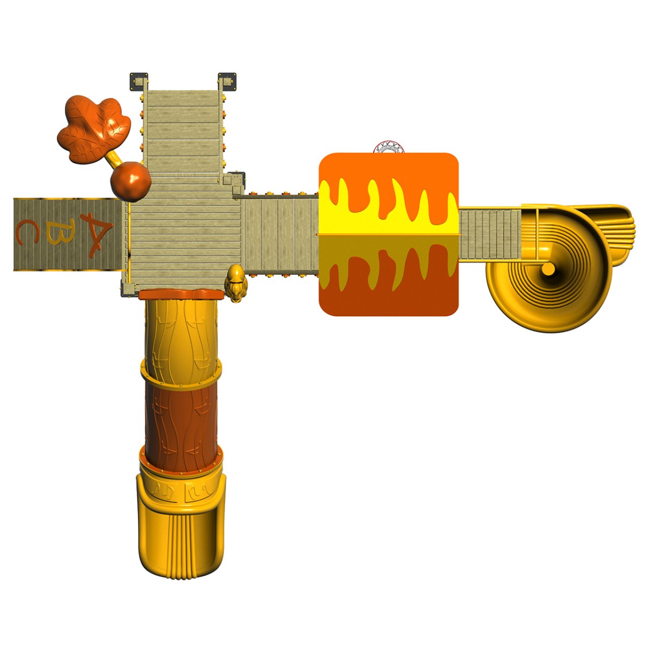 Bu modeli diğerlerinden ayıran en önemli özellik, kuleye çıkış alternatiflerinden biri olan ABC Harfli Tırmanma Rampasıdır. Bu rampa, çocukların tırmanırken harfleri tanımasına ve kaba motor becerilerini geliştirmesine yardımcı olur. Aktivite açısından oldukça zengin olan kulede; macera severler için 1 adet Turuncu Tüp (Tünel) Kaydırak ve heyecanlı bir iniş için 1 adet Sarı Helezon (Spiral) Kaydırak bulunmaktadır. Okul öncesi kurumlar, kolejler ve site parkları için hem eğitici hem de eğlendirici harika bir seçenektir.