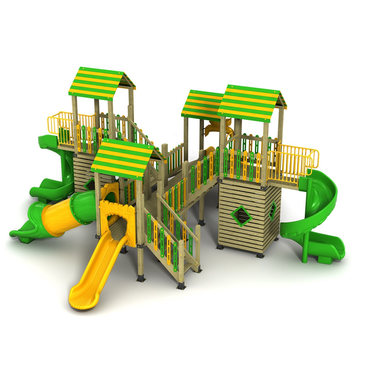Ve 1 adet Yeşil Kavisli Kaydırak. Sarı ve yeşil renkli çatıları, sağlam ahşap merdivenleri ve doğal dokusuyla site bahçeleri, kolejler ve orman içi parklar için hem estetik hem de dayanıklı bir tercihtir.