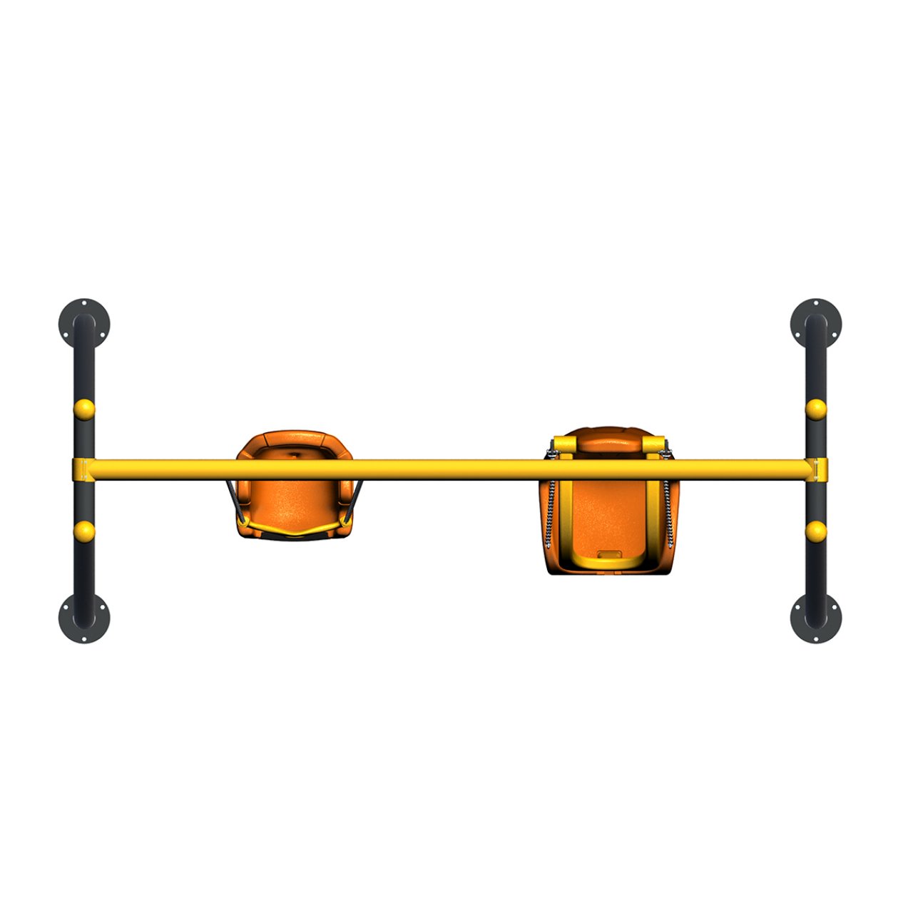 Sağ taraftaki Engelli Koltuğu, yüksek sırt desteği ve kilitlenebilir sarı güvenlik barı ile fiziksel engeli bulunan çocuklara tam koruma sağlar. Sol taraftaki Bebek Koltuğu ise ön bariyeri sayesinde 0-3 yaş grubu miniklerin düşmesini engeller. Antrasit ayaklar ve sarı üst kirişten oluşan sağlam metal boru profil gövde, her iki koltuğu da güvenle taşır. Bu model, özellikle kapsayıcı (inklüziyon) park projeleri için ideal bir çözümdür.