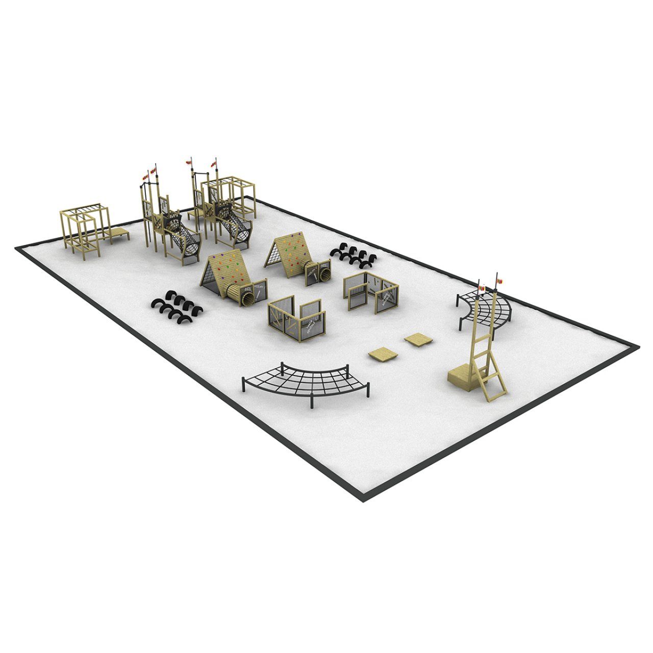 - Modüller: Denge köprüsü, lastikli geçiş, tırmanma duvarı, ağ tünel, maymun barları ve çeşitli engel istasyonları.