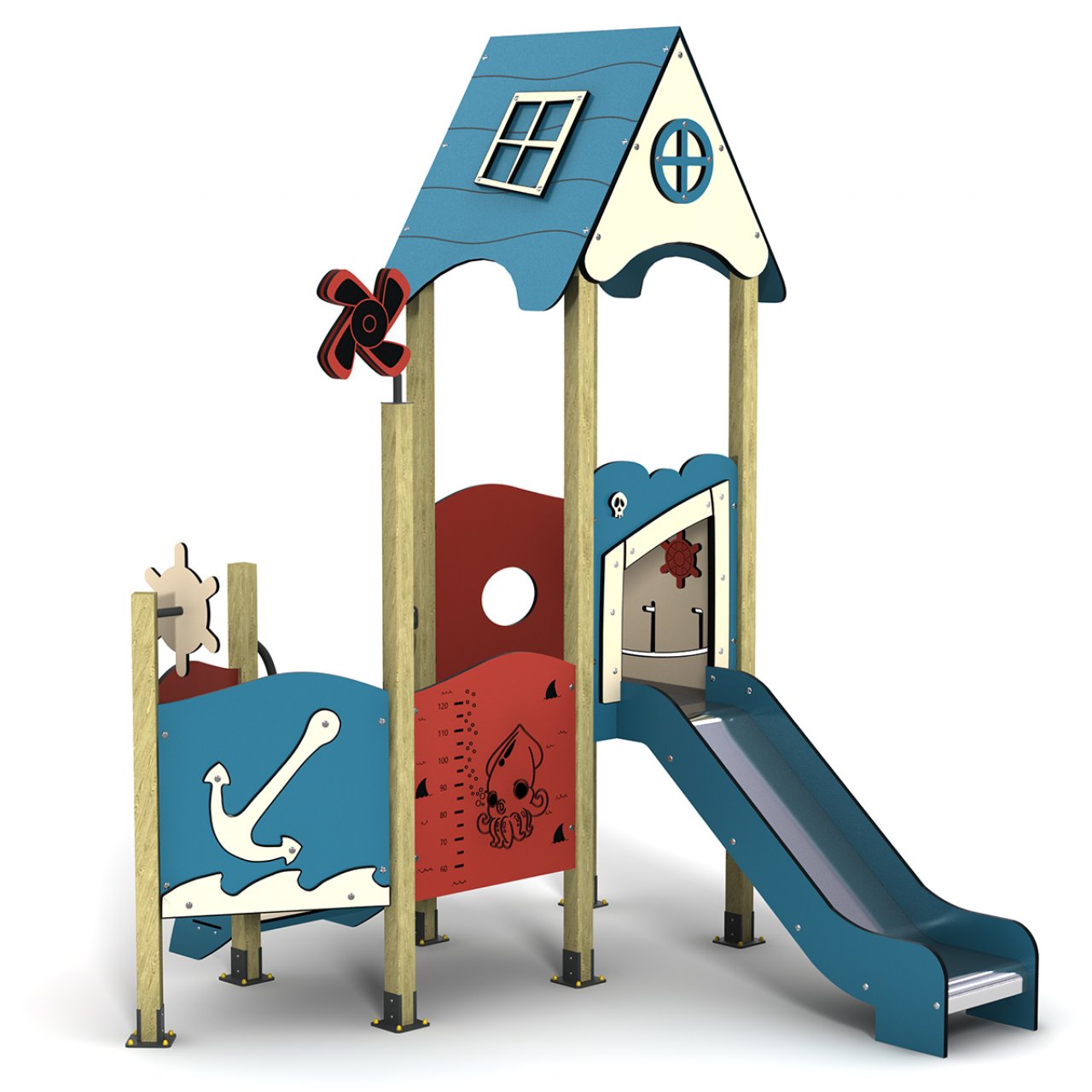 Ürünün en dikkat çekici yanı, eğitici ve eğlenceli görsel panelleridir. Yan gövdede; denizi simgeleyen Beyaz Çapa (Anchor) Figürü ve çocukların boylarını ölçebilecekleri eğlenceli Ahtapotlu Boy Cetveli paneli bulunur. Güvertede yer alan Gemi Dümeni ve direk üzerindeki Rüzgar Gülü (Pervane), minik kaptanların hayal dünyasını zenginleştirir. Dayanıklı kare ahşap dikmeler üzerine kurulan bu yapı, şık mavi çatısı ve uzun ömürlü Metal (Krom) Yüzeyli Kaydırağı ile parklara değer katar.