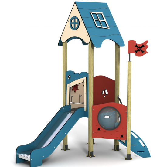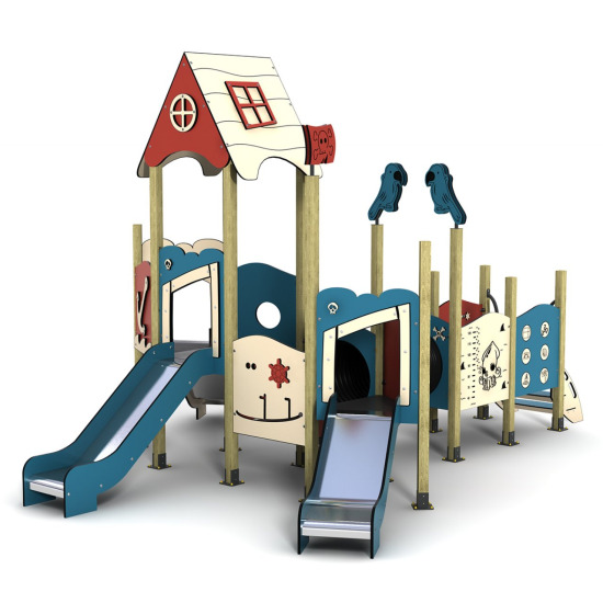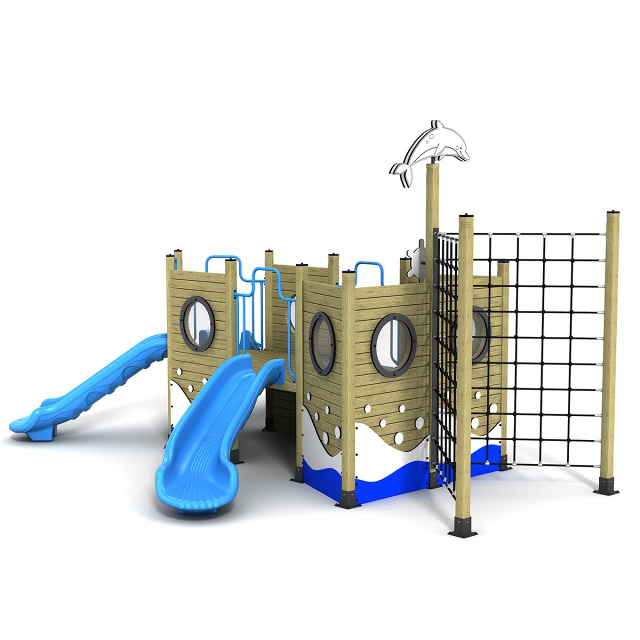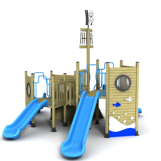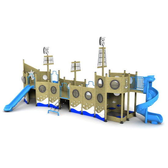 Ürünün ana direğinin zirvesinde, çocukları selamlayan sevimli bir Yunus Figürü yer alır. Ahşap gövdenin doğallığı; mavi kaydıraklar ve beyaz dalga detaylarıyla birleşerek ferah bir okyanus havası yaratır. Geminin güvertesinden aşağıya inen tam 3 Adet Düz Kaydırak (biri sağda, ikisi solda veya tam tersi montaj imkanıyla) sayesinde parktaki bekleme süreleri azalır, eğlence kesintisiz devam eder. Gövde üzerindeki yuvarlak Lumbozlar (Pencereler) ve gemi dümeni, rol yapma oyunları için harika detaylardır.